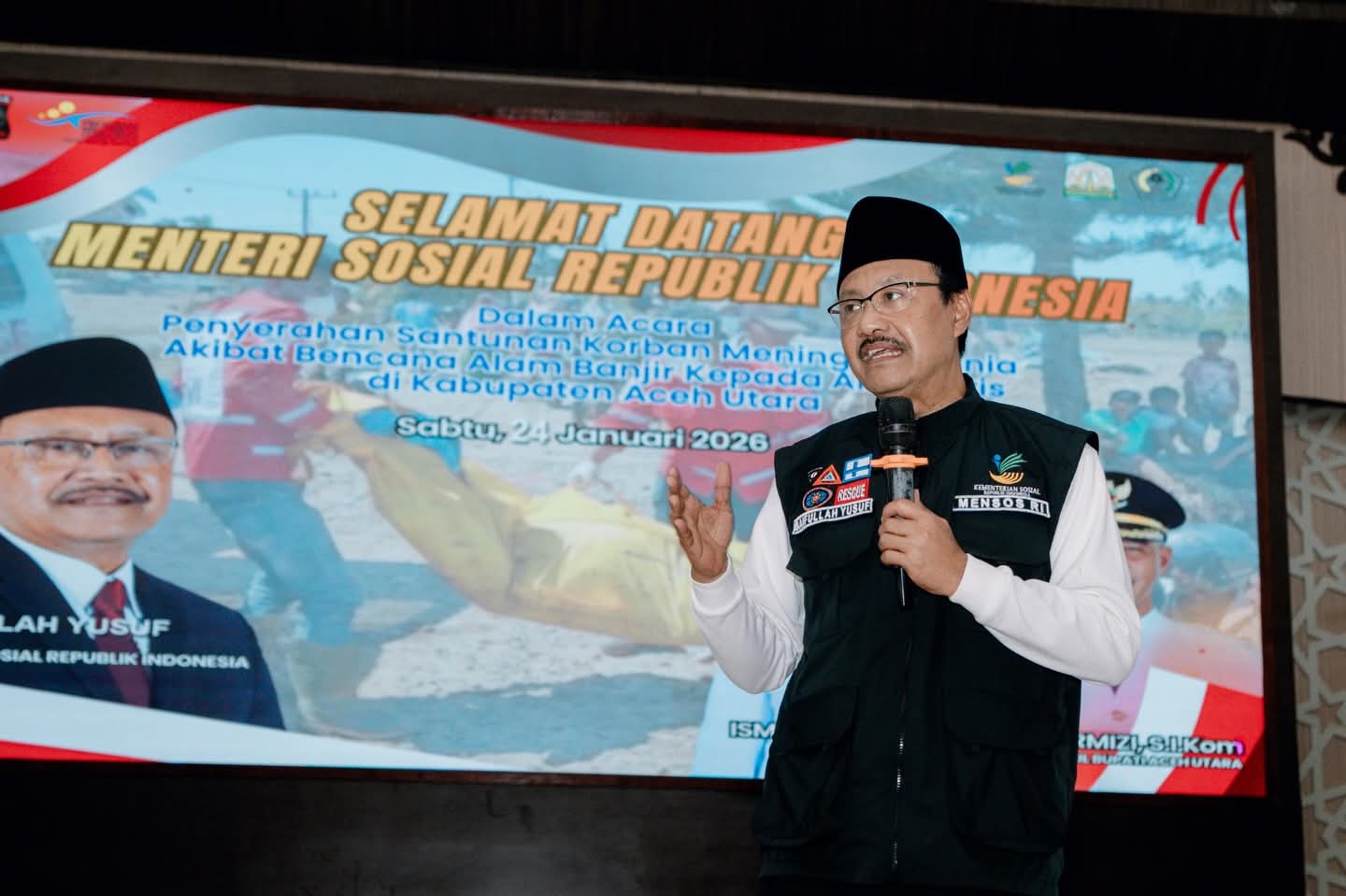 LHOKSUKON – Menteri Sosial RI, Saifullah Yusuf yang akrab disapa Gus Ipul, menyerahkan secara langsung santunan bagi korban meninggal dunia akibat bencana banjir di Kabupaten Aceh Utara. Penyerahan bantuan ini dilakukan di Aula Kantor Bupati Aceh Utara, Lhoksukon, Provinsi Aceh, Sabtu (24/1/2026).